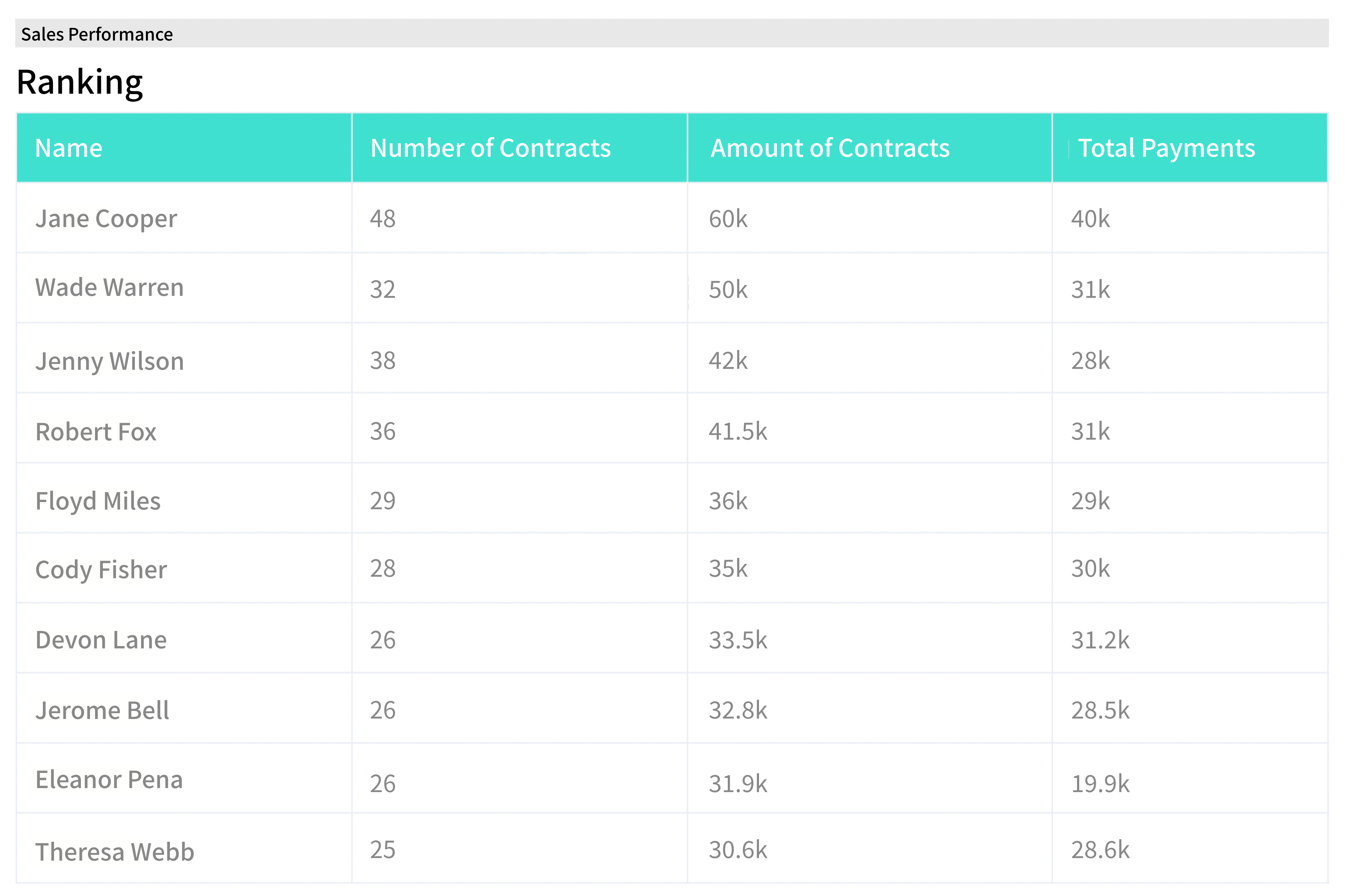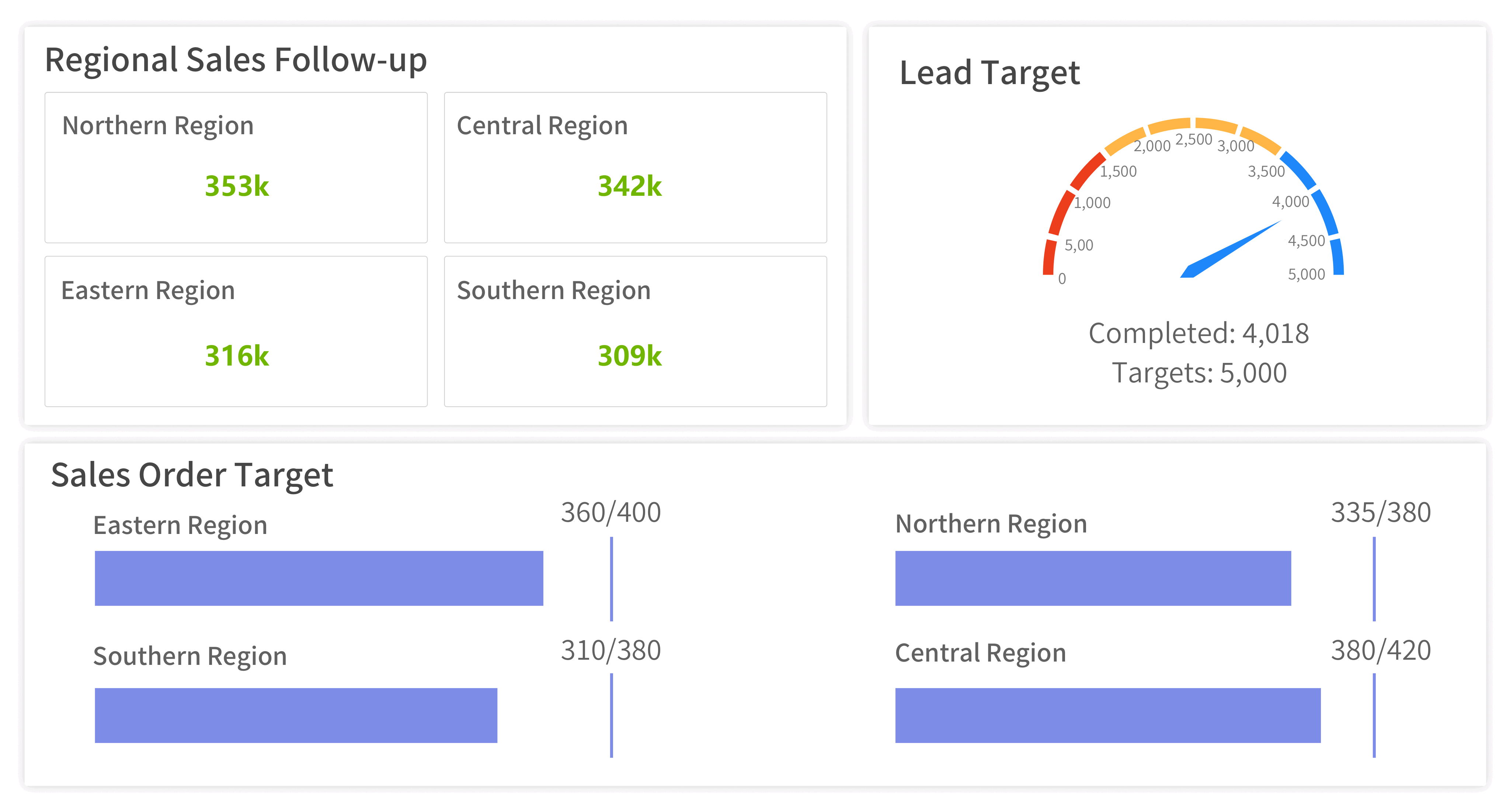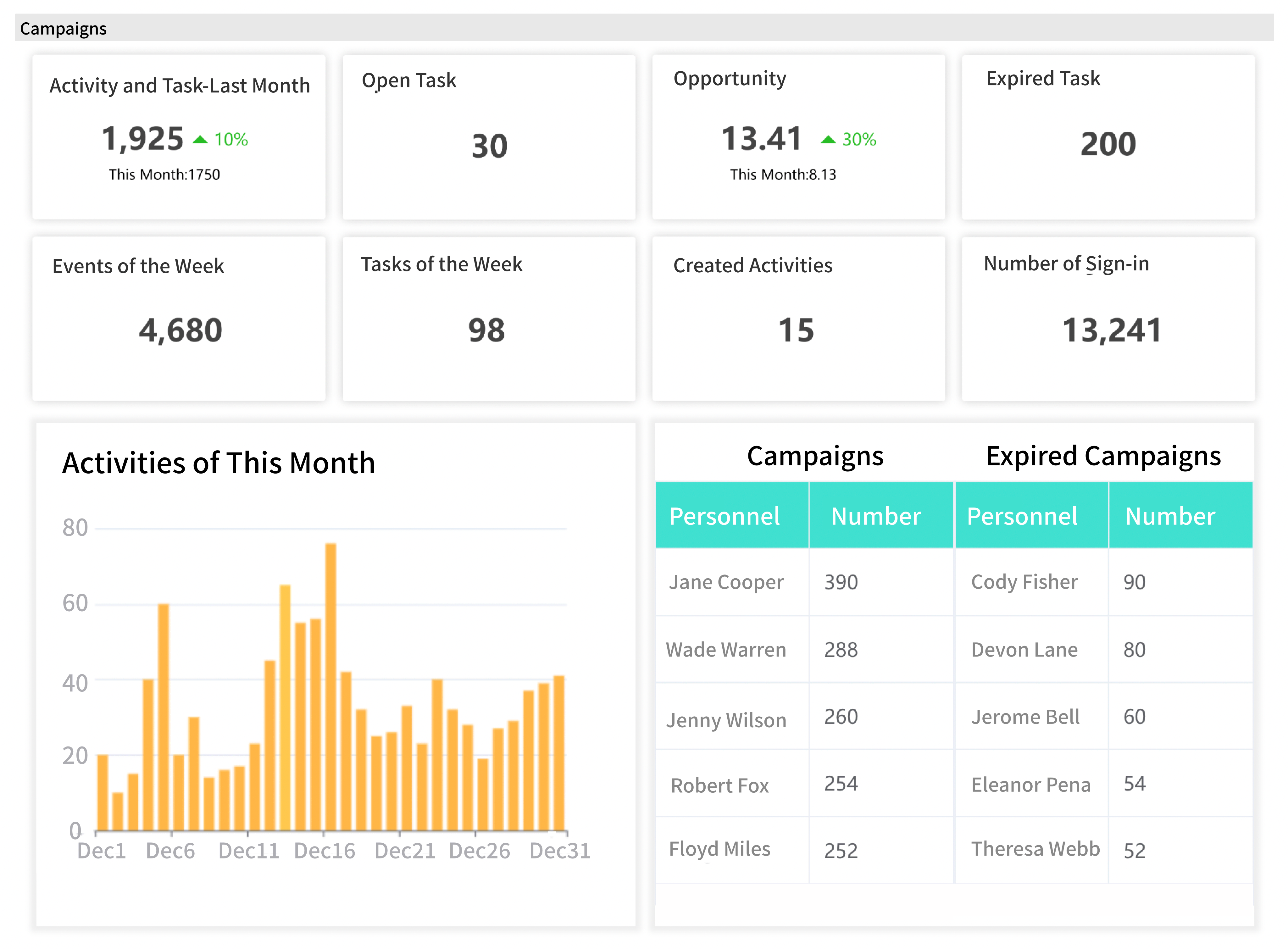KPI charts allow you to pinpoint the key indicators that are most critical to reaching your sales targets, such as the ranking of leads, the ranking of sales amounts, etc. You can easily identify where improvements are needed