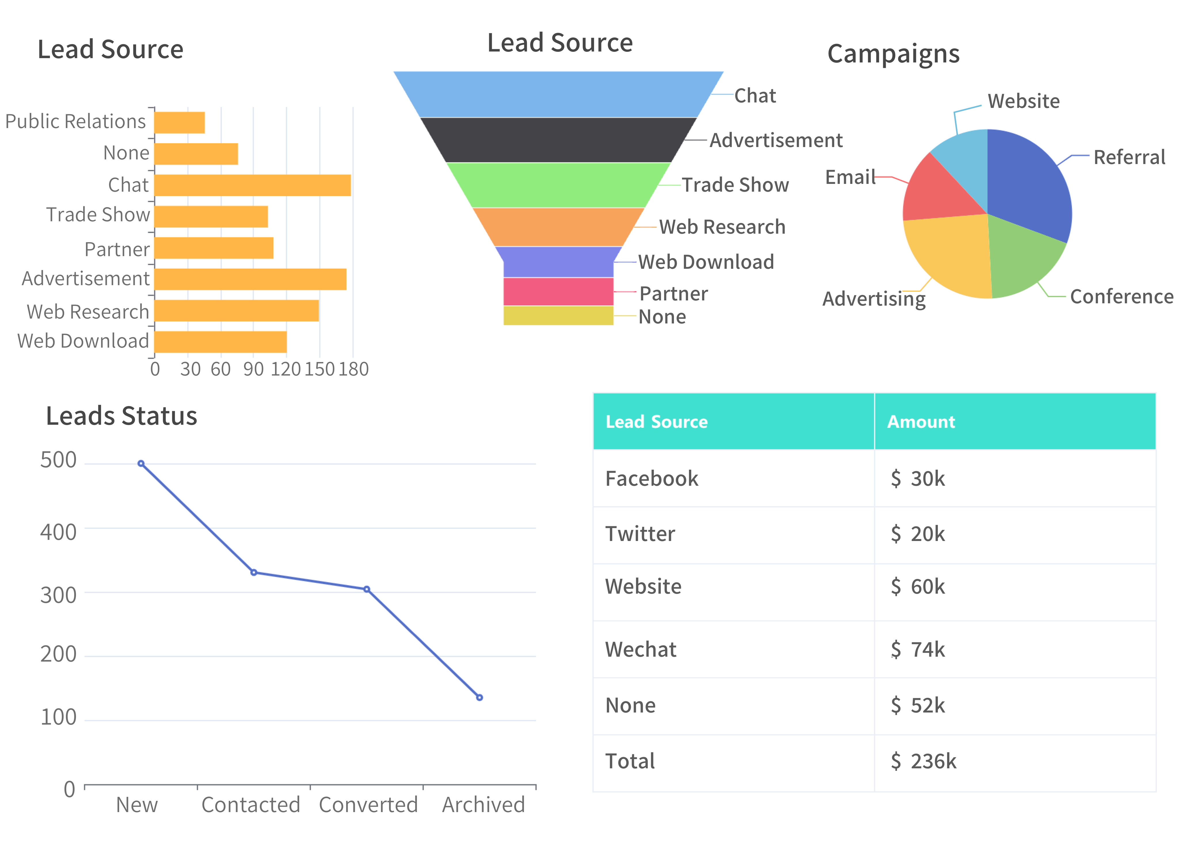 Analyze CRM data from different dimensions, including leads, opportunities, contacts and accounts, contracts, products, and more.