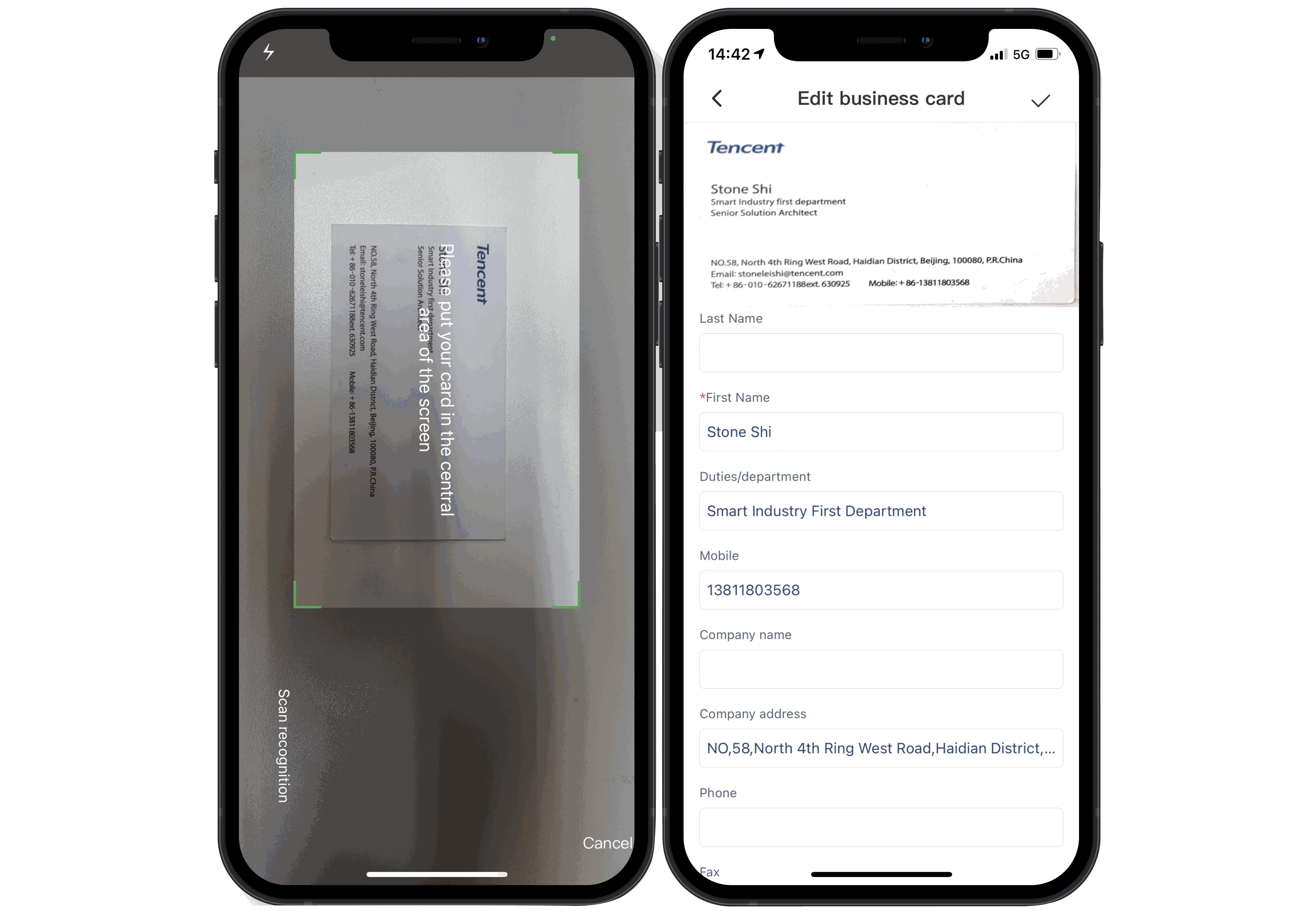 CloudCC automated card scanner allows you to use the camera on your iPhone or Android phone to take business card photos and import them directly into CloudCC CRM as contacts.