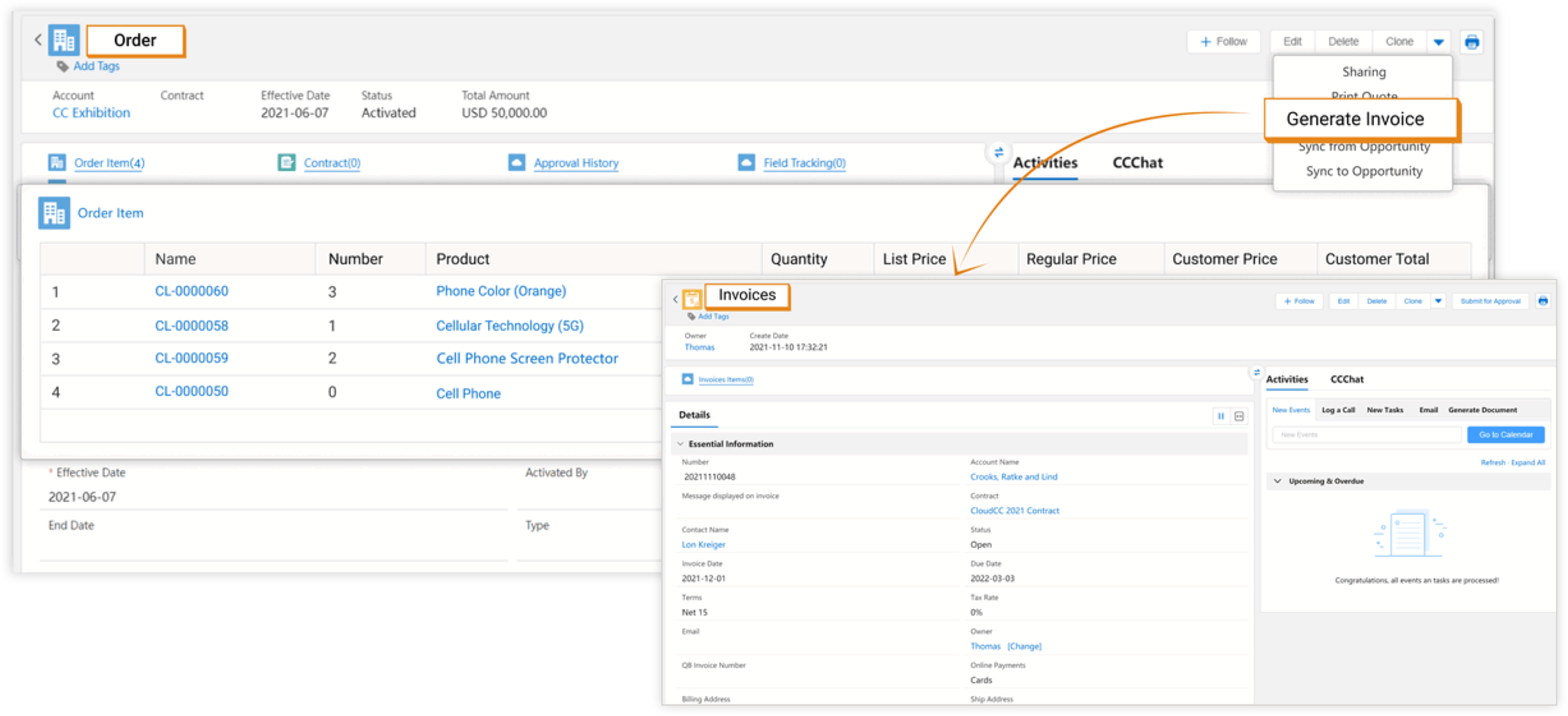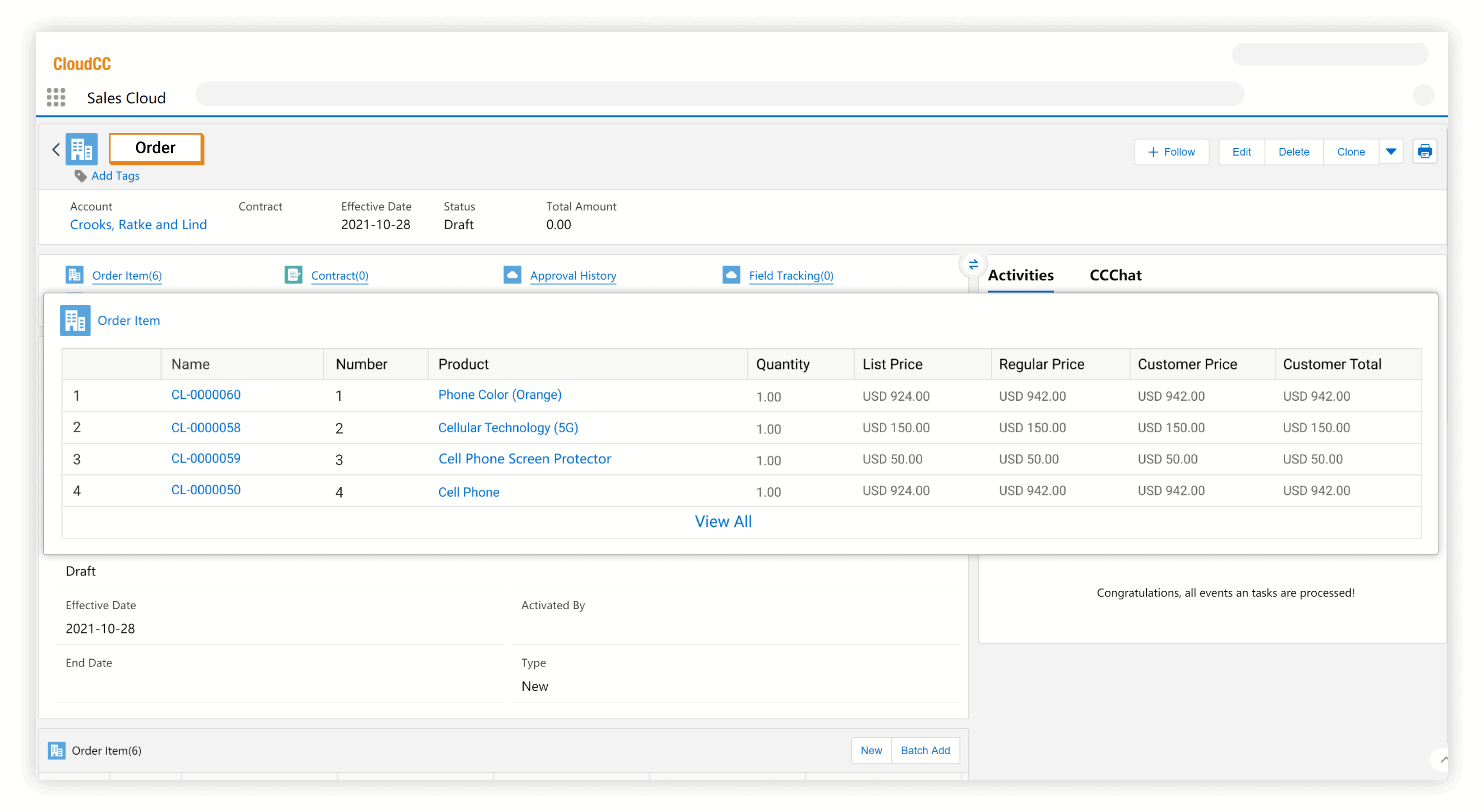 After the quote is confirmed, CloudCC supports generating orders from quotes to automate transaction management.