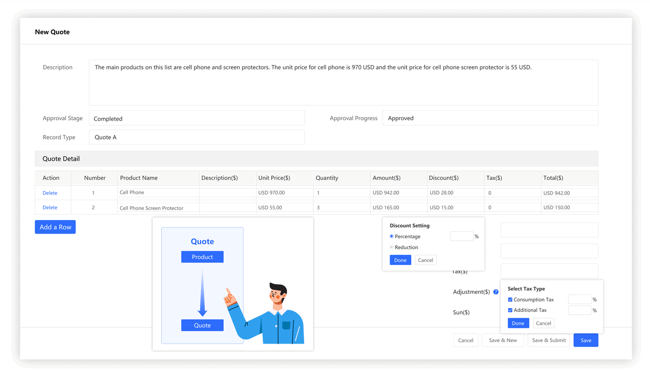 Quickly create quotes and sync quote details within the system, including product lists, price, and discount. Quote information can be synchronized to opportunities in real time. For complex quotation functions, please refer to CPQ module.