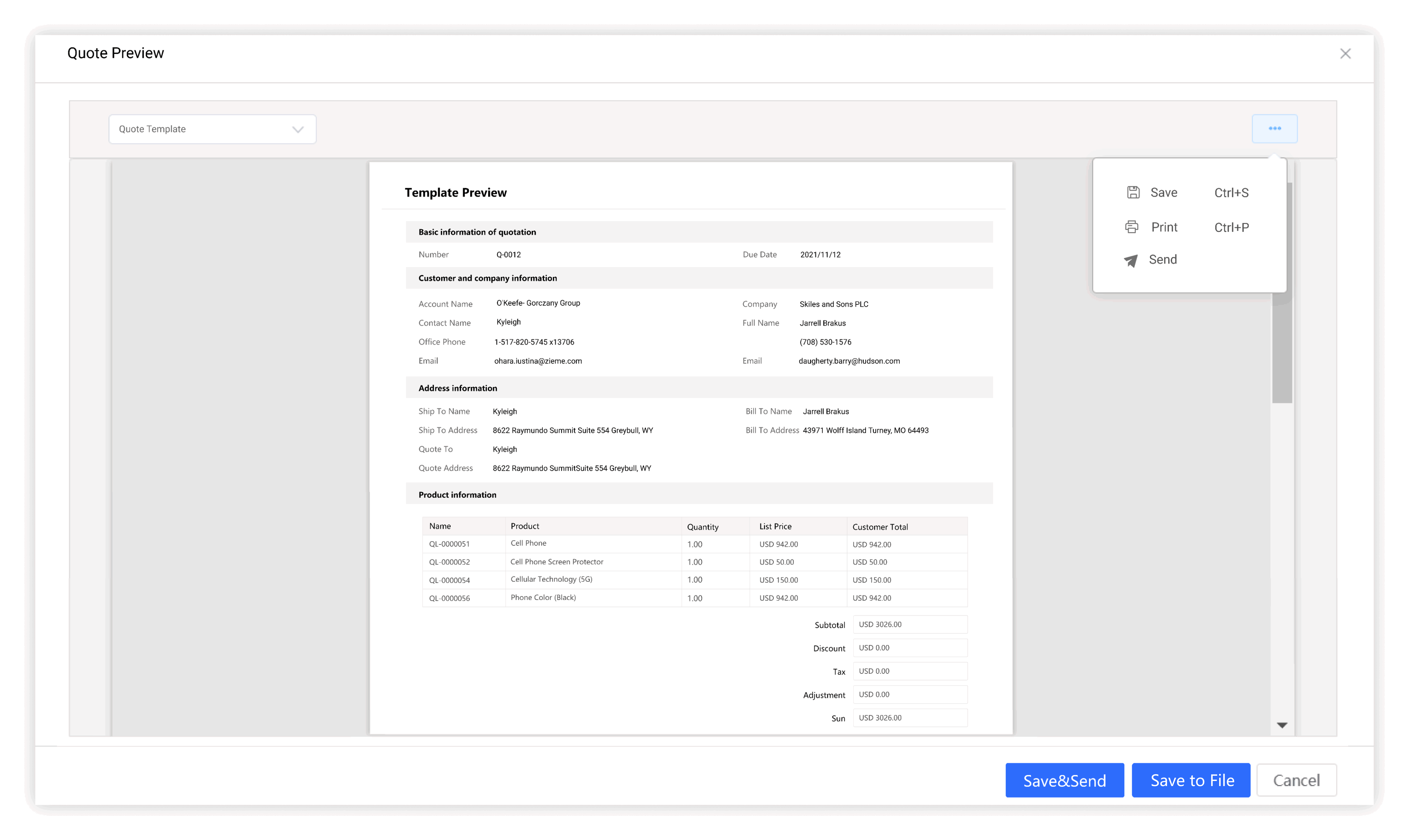 Print quotes via templates and deliver the paper quotes to customers or send to customers by email.